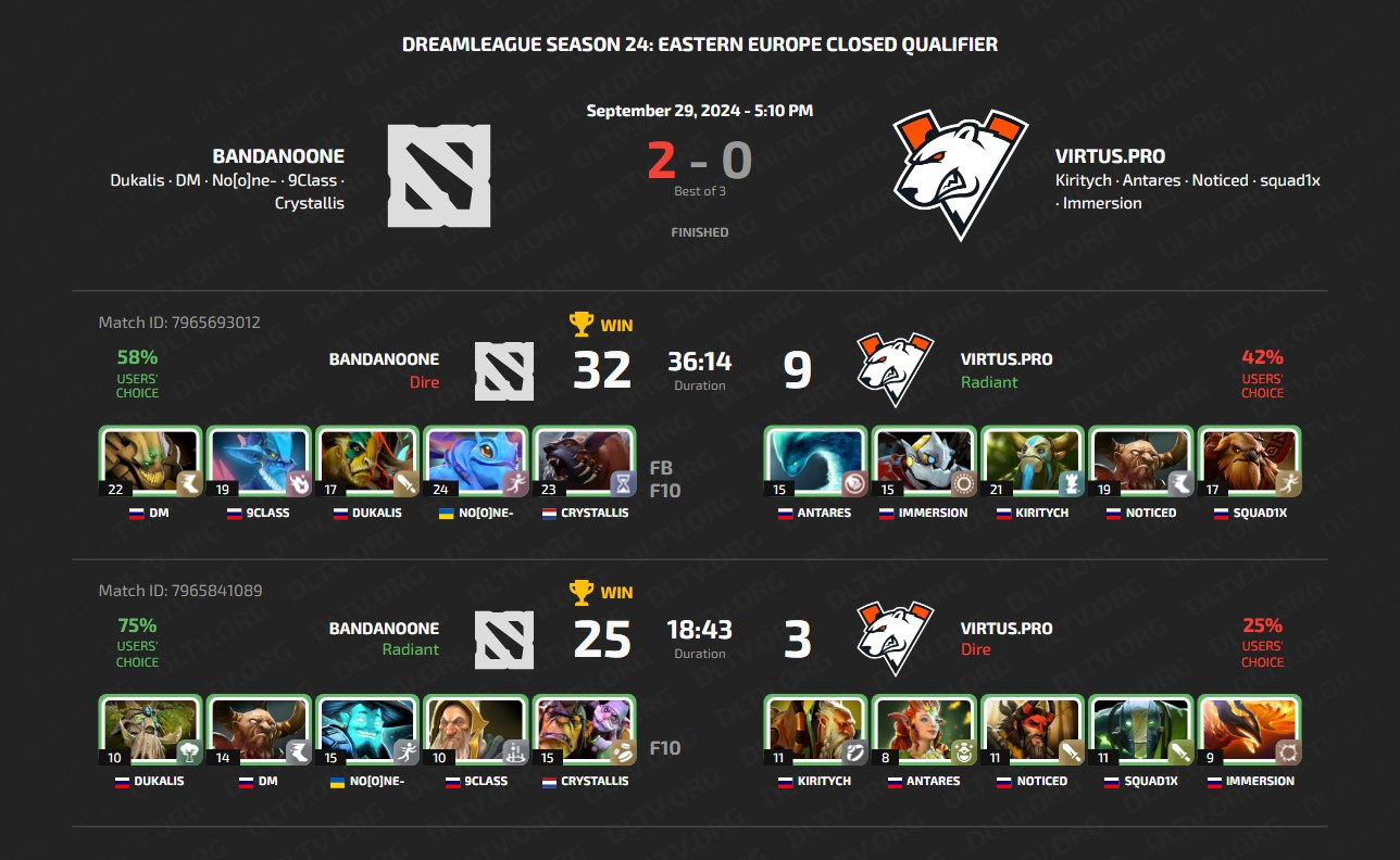 BandaNoone обыграли Virtus.pro со счетом 2-0 в финале квалификации и забрали себе первый Восточно Европейский слот на DreamLeague Season 24. За 7 карт BandaNoone уступили лишь в одной в матче против Team Spirit. Ранее Cloud9 не смогли договориться с игроками и подписать этот состав. Virtus.pro упали в нижнюю сетку и попробуют свои силы вновь против победителя Team Spirit - L1ga Team.