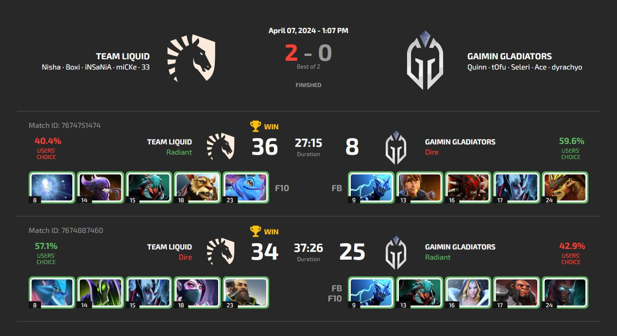 Team Liquid возвращают должок Gaimin Gladiators за прошлый сезон, жидкие без шансов стерли своих заклятых врагов со счетом 2-0. Gaimin Gladiators проиграли еще на стадии драфта, длительность карт составила 27 и 37 минут.
