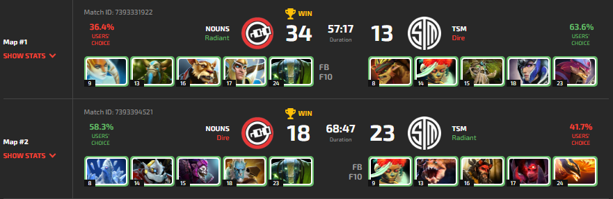 After TSM defeated Shopify Rebellion, Nouns became their next opponent. Despite being third-place in the North American DPC for almost two years, Nouns got their sweet revenge by being the last North American team in the tournament.