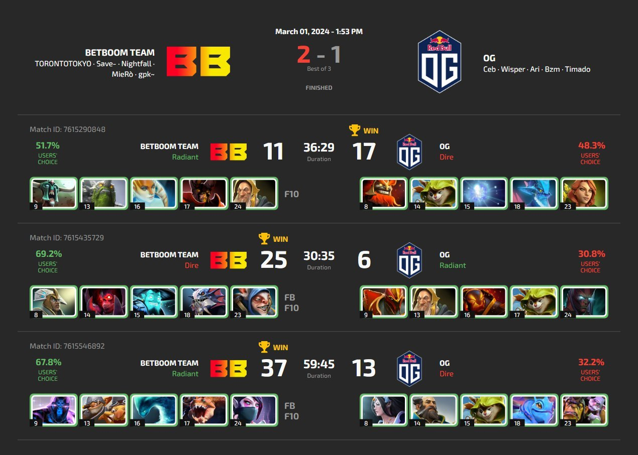 In the final map, the BetBoom Team had the net worth lead against an Alchemist throughout the entire game. OG kept defending, and the game was drawn out. Ultimately, the BetBoom Team could close the map after 59 minutes to win the match.