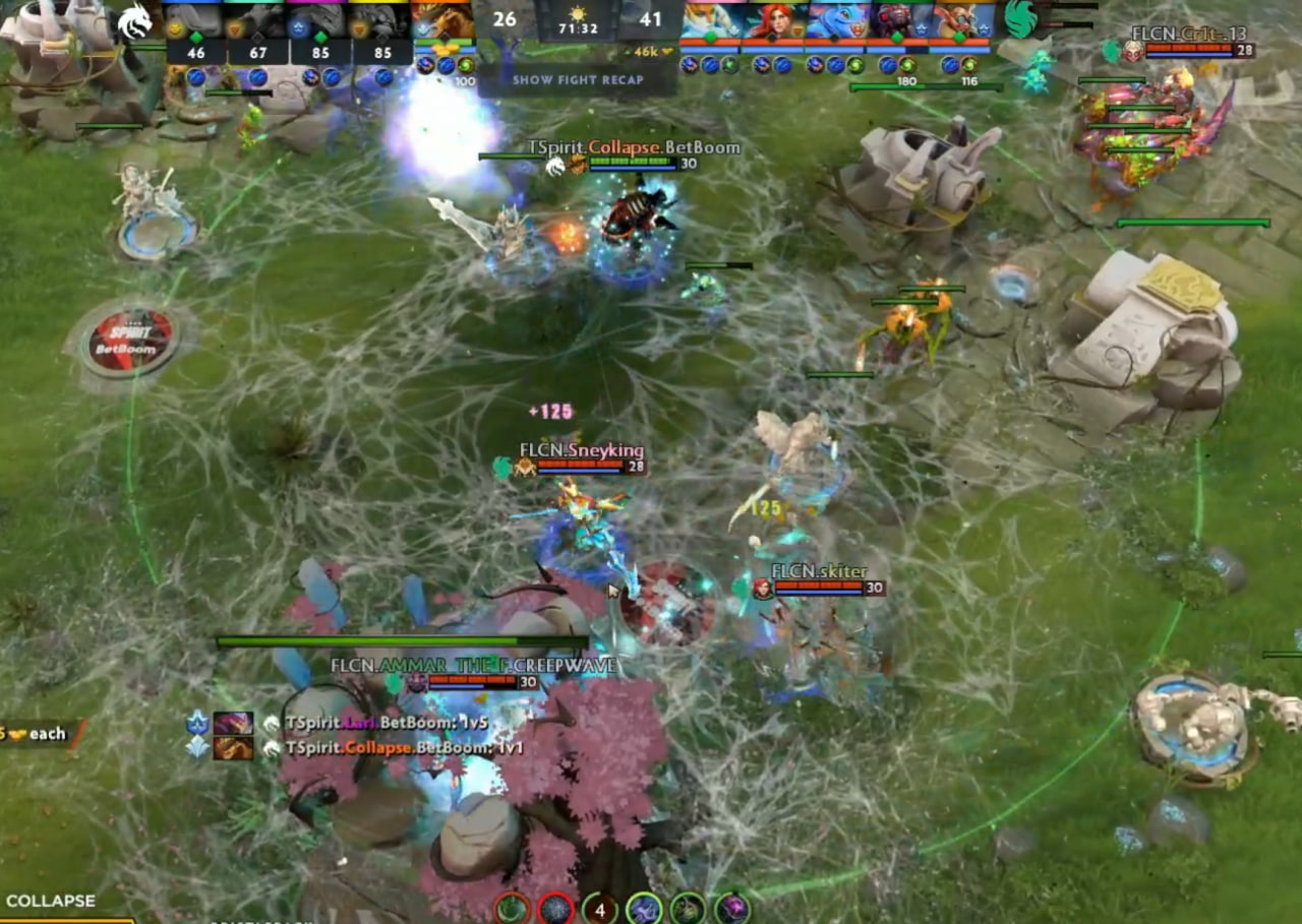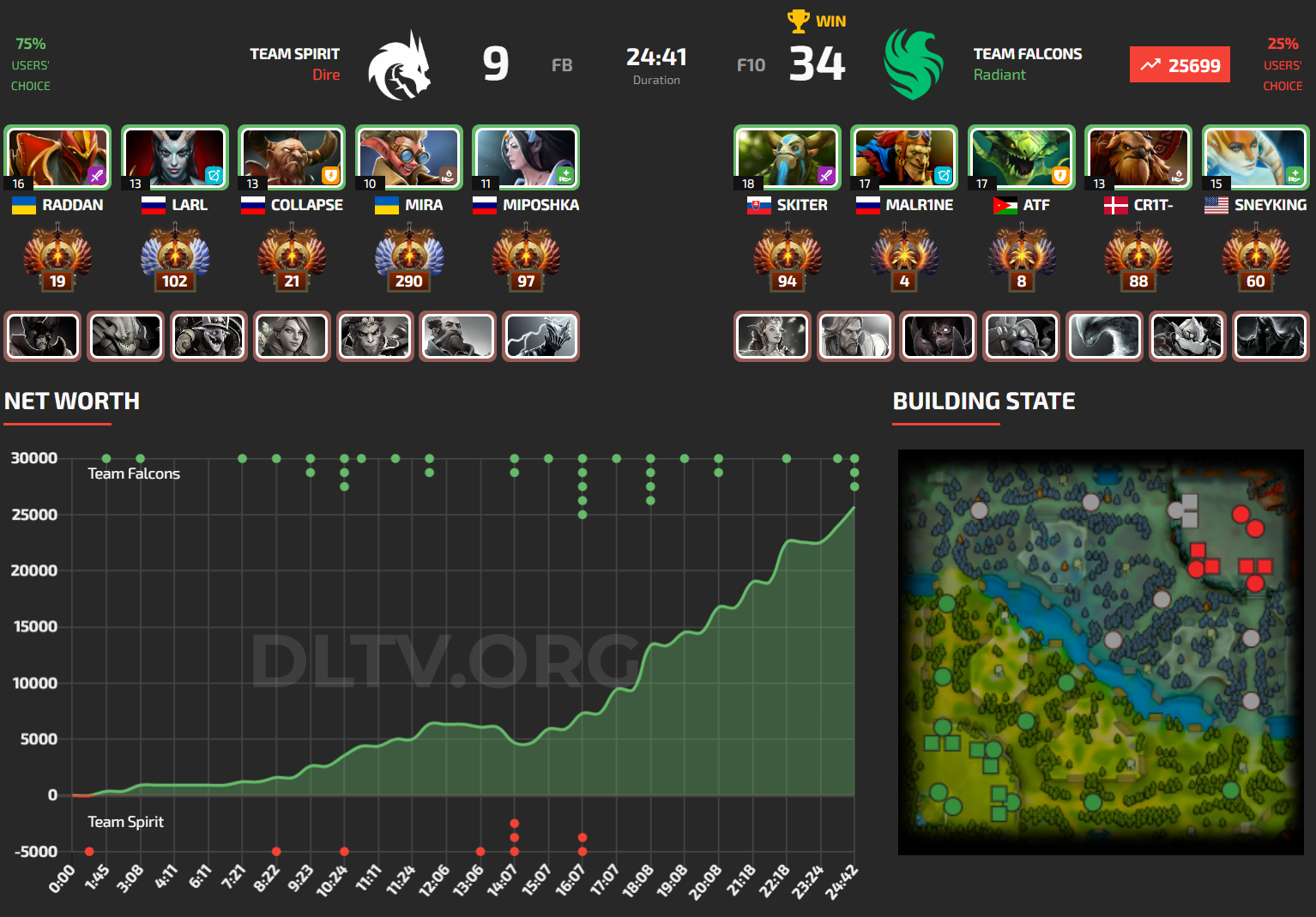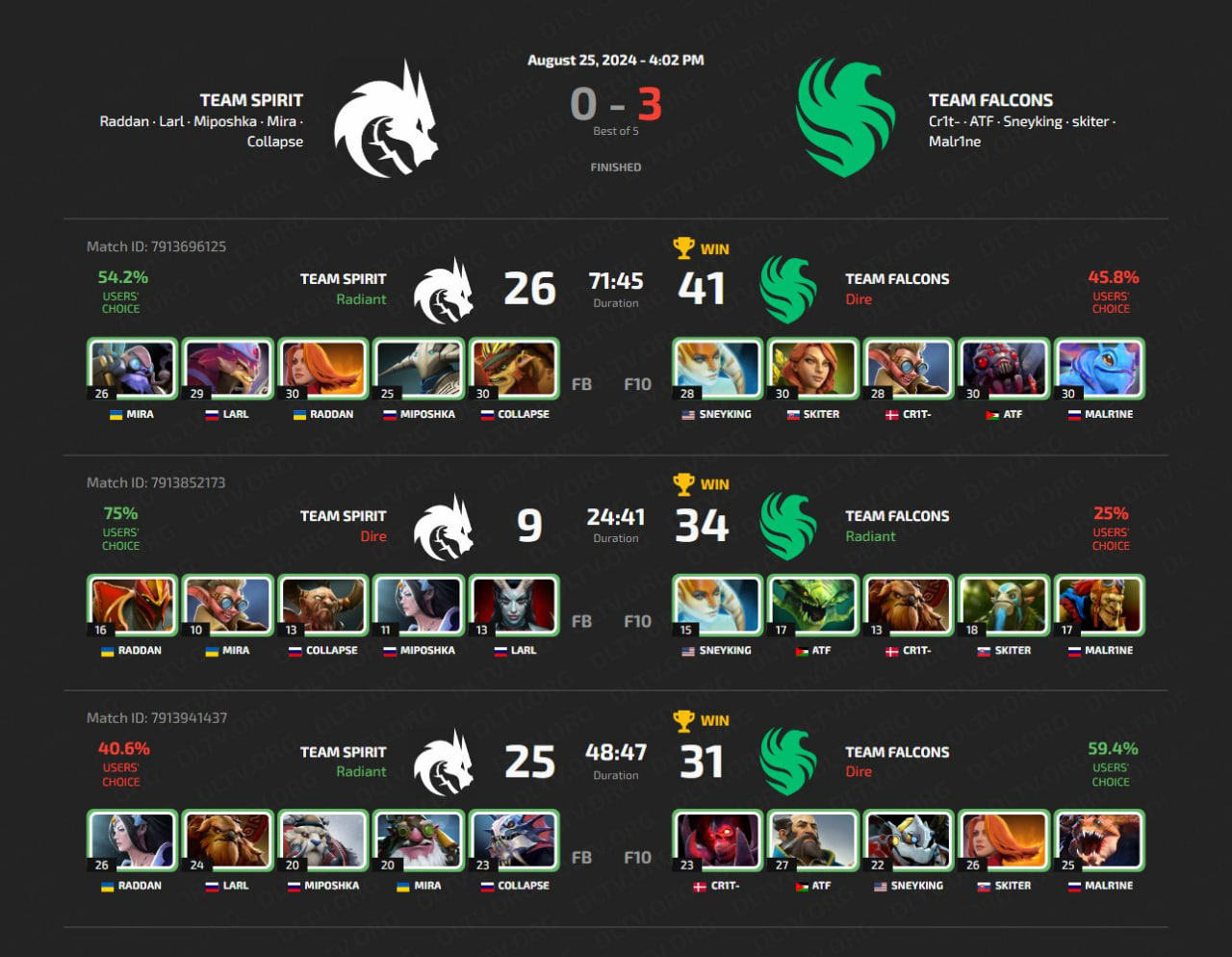 Вторая карта получилась очень легкой для Team Falcons, выбравших нестандартных Nature's Prophet для skiter и Viper для ATF. Cr1t- сыграл на сигнатурном Earth Shaker, а Malr1ne - на Batrider. Sneyking провел очередной матч на метовой пятерке Naga Siren. На 25 минуте Team Falcons имели перевес по общей ценности в 25 тысяч, а Team Spirit, не убив ни одного вражеского героя в последнем файте, написали GG, WP.